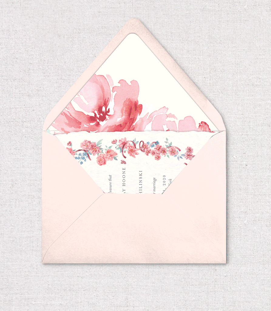 Typically, I recommend you stack your cards from largest on bottom to smallest on top. If some of your cards are the same size, stack those from earliest event to latest event, or put the one you want to see first on top. Tuck your rsvp card under the flap of its envelope.